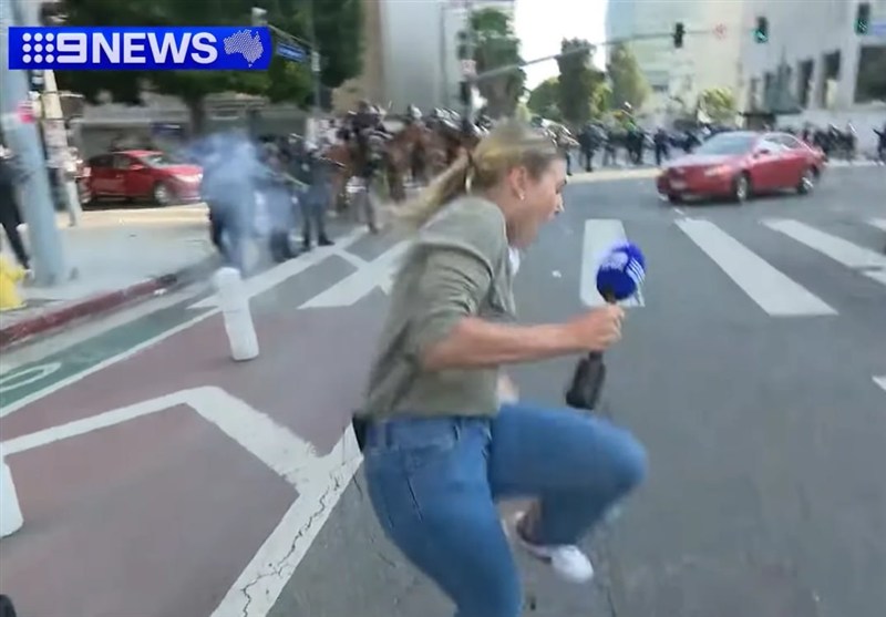Koresponden 9News AS Lauren Tomasi sedang menyiarkan langsung di dekat Pusat Penahanan Metropolitan di pusat kota Los Angeles ketika dia terkena peluru karet yang ditembakkan oleh seorang petugas polisi.