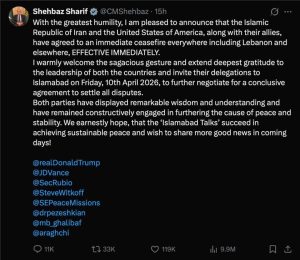 “Dengan kerendahan hati, saya senang mengumumkan bahwa Republik Islam Iran dan Amerika Serikat, bersama sekutu mereka, telah menyepakati gencatan senjata segera di seluruh wilayah, termasuk Lebanon dan lokasi lainnya, yang mulai berlaku sekarang juga.”