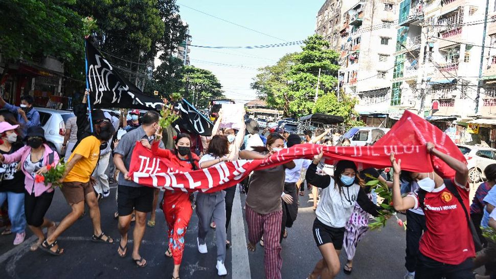 Kejadian ini terjadi di Kyimyindaing, Yangon pada Minggu (5/12). Pawai ini merupakan salah satu bagian dari tiga pawai lain yang diselenggarakan di wilayah itu.. (Photo by AFP)