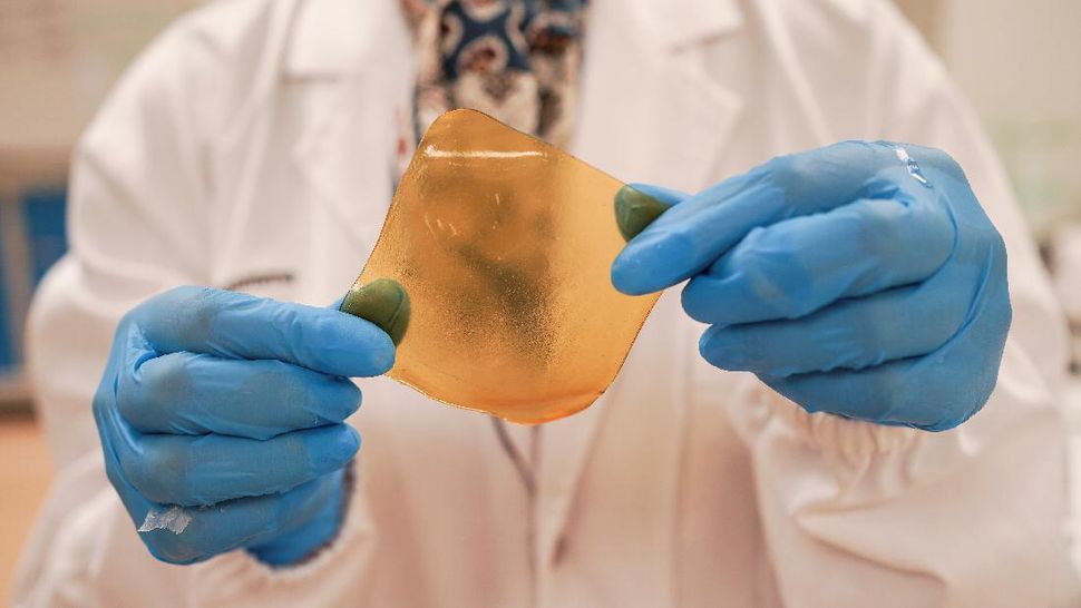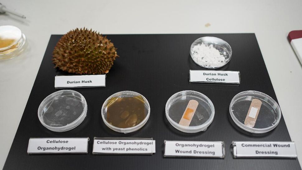 Keunggulan perban gel dari sampah kulit durian itu adalah mampu membuat suhu di sekitar luka pada tubuh lebih rendah dan menjaga kelembaban jaringan kulit di sekitarnya sehingga mempercepat penyembuhan luka. Menurut Direktur Ilmu Pengetahuan Makanan dan Teknologi NTU, Prof. William Chen, ongkos pembuatan perban antibakteri dari bahan baku sampah makanan lebih rendah dari metode konvensional. (REUTERS/Travis Teo)