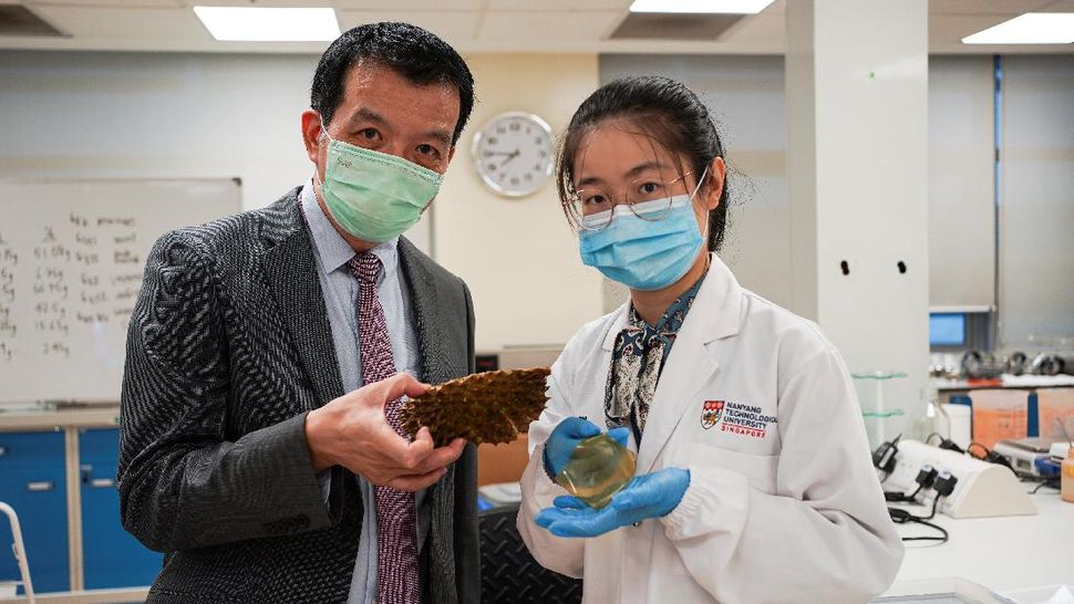 Para peneliti di Universitas Teknologi Nanyang (NTU) Singapura berhasil membuat perban gel antibakteri dari sampah kulit durian. (REUTERS/Lee Ying Shan)
