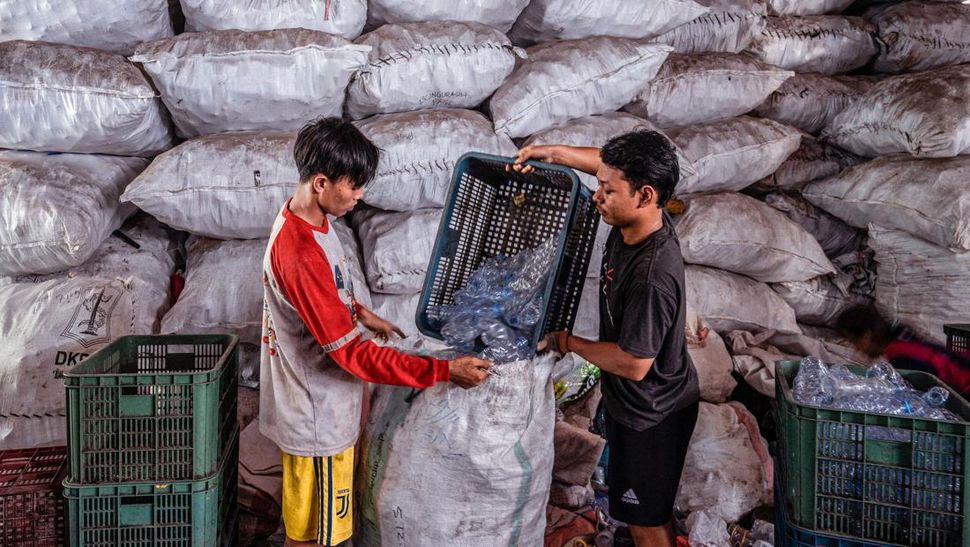 PurnaWarta – Para pekerja memilah dan mengemas limbah plastik bekas yang dikumpulkan dari penukaran tiket bus kota di Surabaya, sebelum dijual kembali ke pabrik daur ulang plastik. (AFP Photo/Juni Kriswanto)