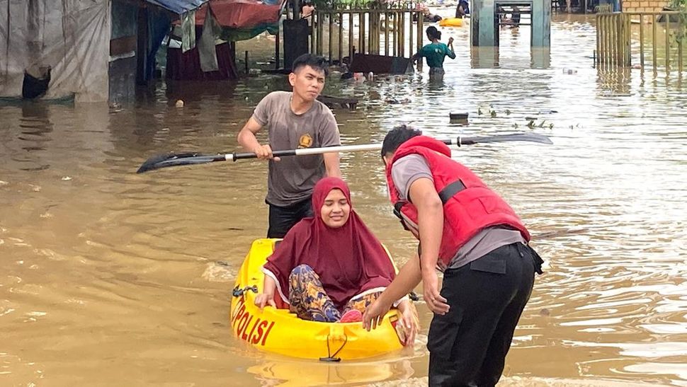 PurnaWarta – Seorang warga menaiki perahu saat banjir di Pasar Youtefa Abepura, Papua, Jumat (7/1). Berdasarkan data BNPB hujan lebat dan tanah longsor di sejumlah wilayah Jayapura telah mengakibatkan enam orang meninggal duniar. (ANTARA FOTO/Adharnazamudin/wpa/hp).
