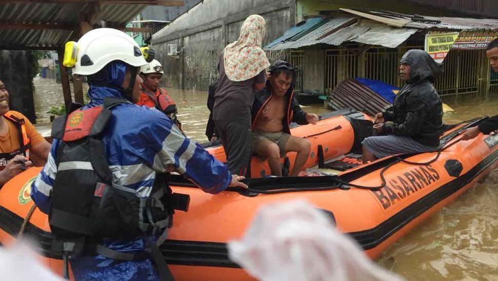 Petugas Basarnas mengevakuasi warga yang terjebak banjir di permukiman kawasan Kali Acai Abepura, Papua, Jumat (7/1). (ANTARA FOTO/Adharnazamudin/wpa/hp).