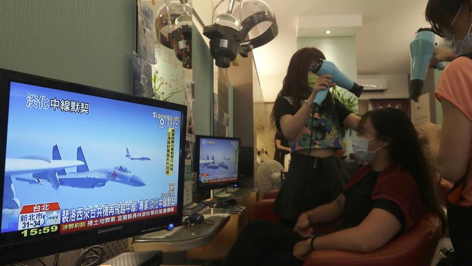 Sebanyak 68 pesawat tempur menerobos garis tersebut meski hanya sebentar, menurut seorang sumber Taiwan. (AP Photo/Ng Han Guan)
