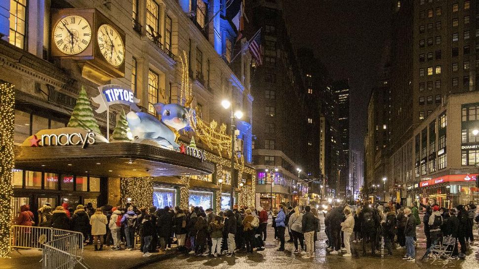 Orang-orang mengantre di Macy’s menjelang hari diskon Black Friday di wilayah Manhattan di New York City, New York, AS, Jumat (26/11). Namun sejarah lain juga muncul di balik istilah Black Friday ini. Disebutkan bahwa istilah Black Friday kental dengan jual beli budak dengan harga diskon pada kurun waktu 1800-an. (REUTERS/Jeenah Moon)