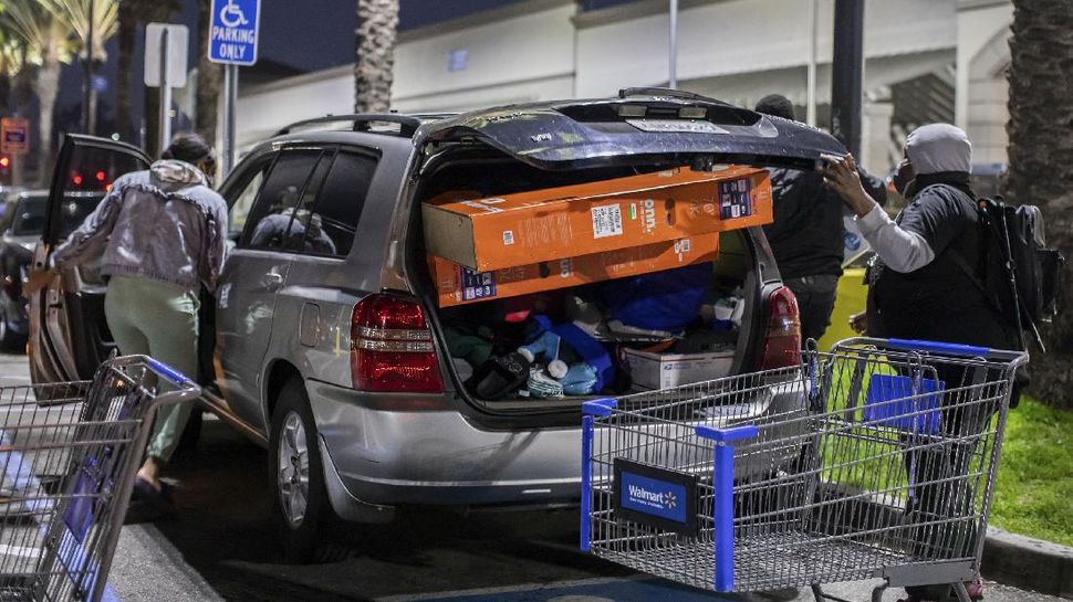 Bagasi mobil di tempat parkir Walmart dimuat dengan dua set televisi dan barang-barang lainnya setelah belanja Black Friday pada Jumat (26/11) di Torrance, California. (Apu GOMES / AFP)