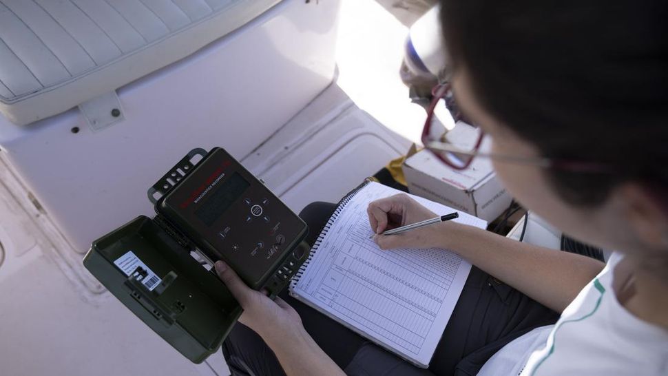Ahli biologi Mariana Barbosa (28) dari Maqua atau Laboratory of Aquatic Mammals and Bioindicators, mencatat suara lumba-lumba Guyana. Pada tahun 80-an populasi lumba-lumba Guyana diperkirakan mencapai 400 ekor dan sekarang pada tahun 2022, hampir tidak lebih dari 30 ekor. (AP Photo/Silvia Izquierdo)