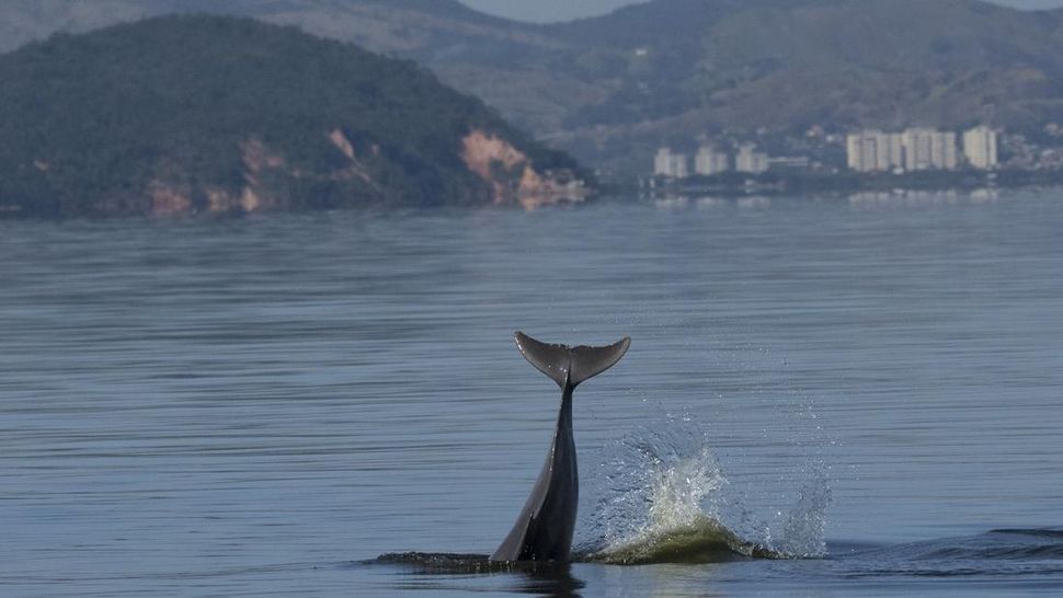 Para peneliti mengatakan kelompok lumba-lumba yang terlihat di Teluk Guanabara menunjukkan tanda-tanda pemulihan, di mana sebelumnya manusia membuat polusi di lepas pantai Rio dan menangkap ikan secara berlebihan yang menghabiskan sumber makanan bagi lumba-lumba. (AP Photo/Silvia Izquierdo)