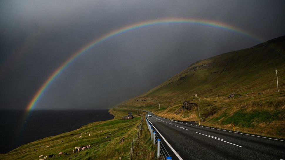 Pelangi muncul di Skalafjord dekat kampung Skali di Pulau Eystroy. Kesederhanaan serta ketenangan Faroe juga menjadi sajian utama para pelancong yang ingin sejenak melepaskan diri dari penatnya kehidupan kota. (Jonathan NACKSTRAND / AFP)