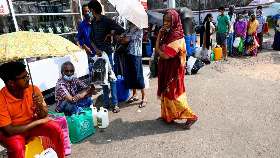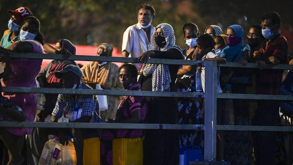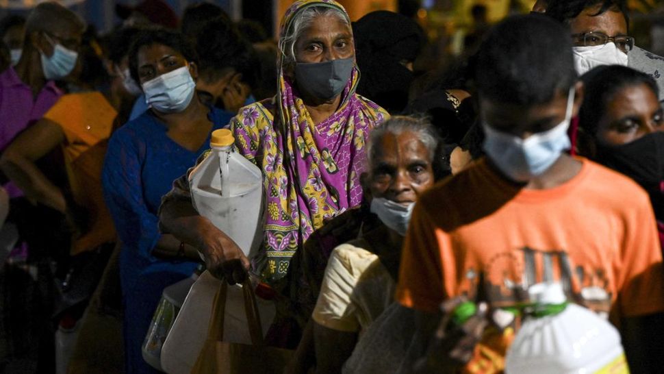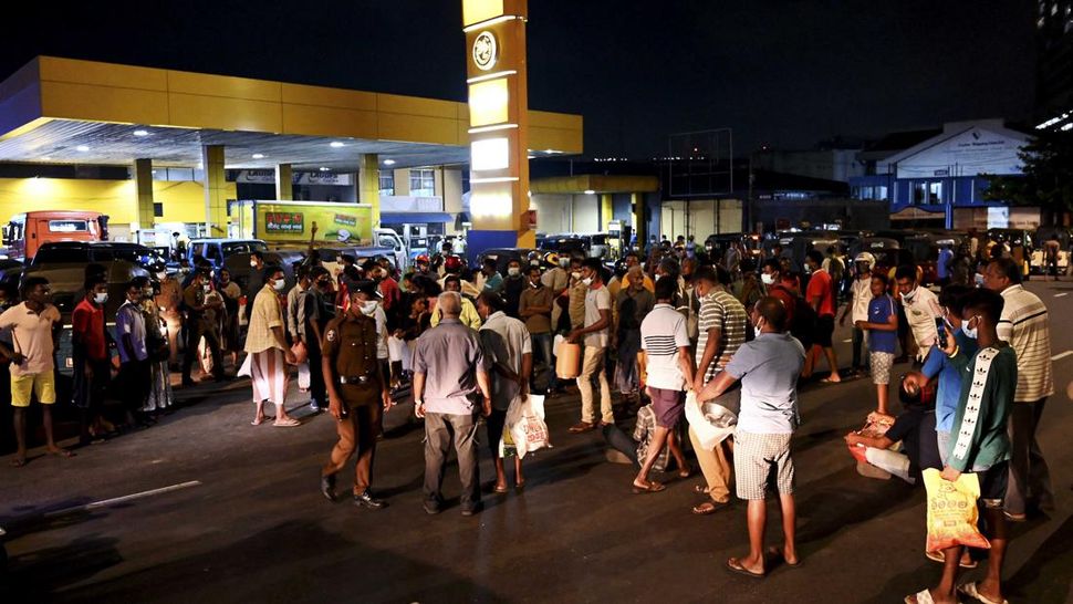 Akibat krisis itu, masyarakat harus antre untuk mendapatkan bahan bakar minyak (BBM) di sebuah pom bensin di Kolombo pada Rabu (23/3) kemarin. (Photo by Ishara S. KODIKARA / AFP).
