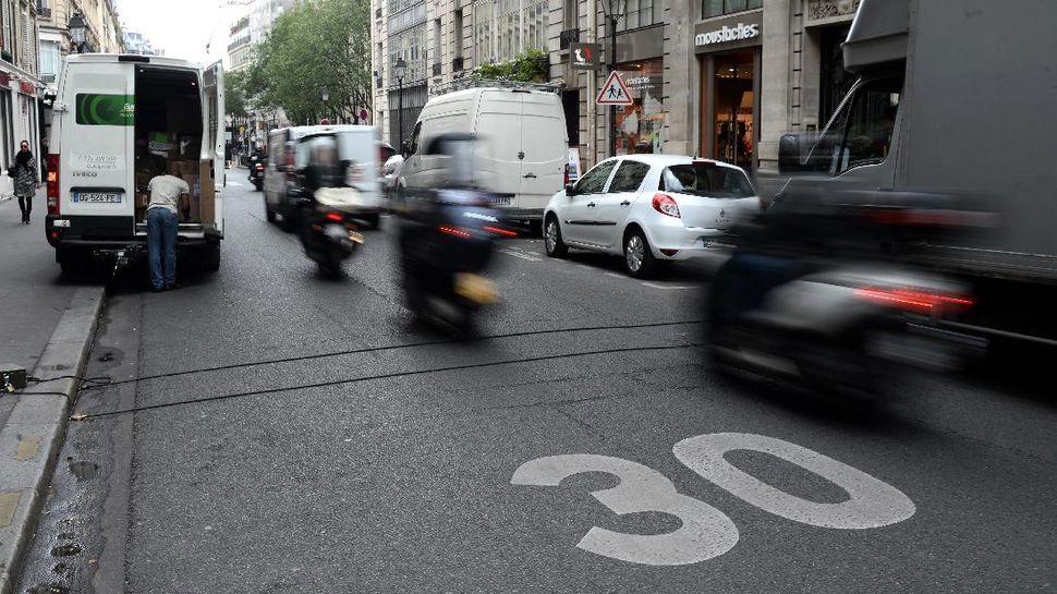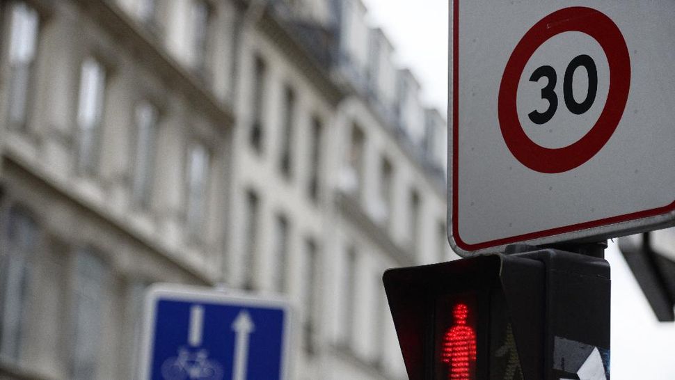 Pembatasan kecepatan 30 km/jam untuk menurunkan emisi gas buang kendaraan dan meningkatkan keselamatan pengguna jalan. (Photo by MARTIN BUREAU / AFP)