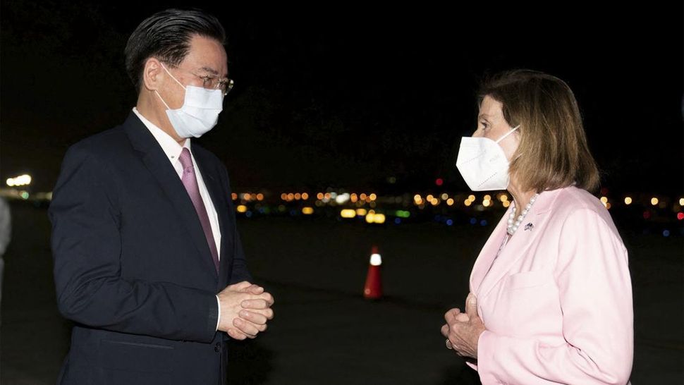 Menteri Luar Negeri Taiwan Joseph Wu menyambut kedatangan Pelosi di Taipei Songshan Airport pada Selasa malam. (Taiwan Ministry of Foreign Affairs/Handout via REUTERS)