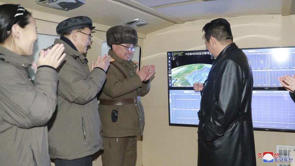 Surat kabar Partai berkuasa Korut, Rodong Sinmun, merilis foto-foto Kim yang menyaksikan peluncuran tersebut. Hal yang tak lazim dilakukan mereka. Kim Jong-un terlihat tengah berbicara dengan beberapa pejabat yang bertepuk tangan sumringah setelah uji coba rudal hipersonik diklaim berhasil. (KCNA via REUTERS)