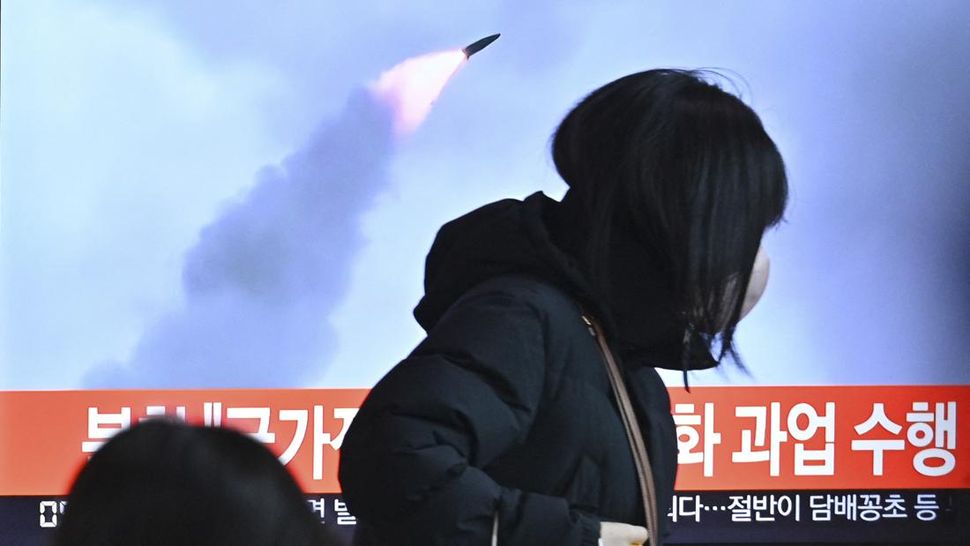 Peluncuran rudal hipersonik Korut ini pun membuat negara tetangg seperti Korea Selatan dan Jepang kelabakan. Media Korsel pun menayangkan kabar uji coba rudal Korut itu di televisi nasional. (Photo by Anthony WALLACE/AFP)