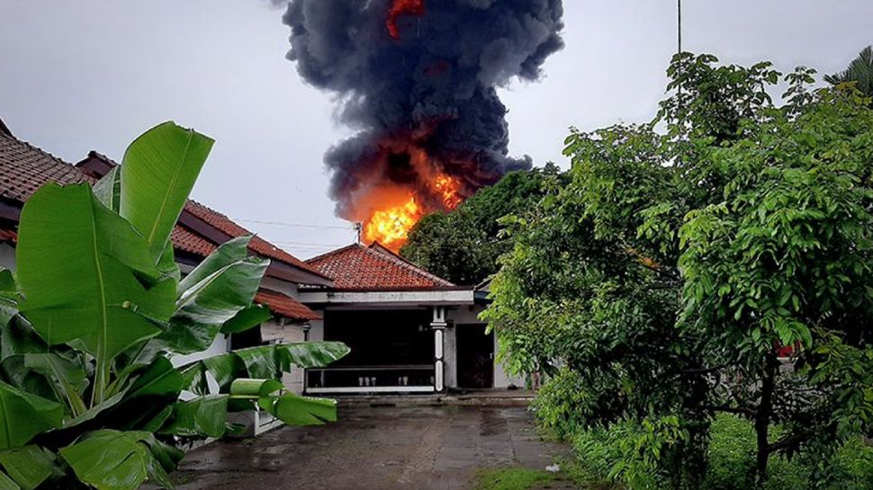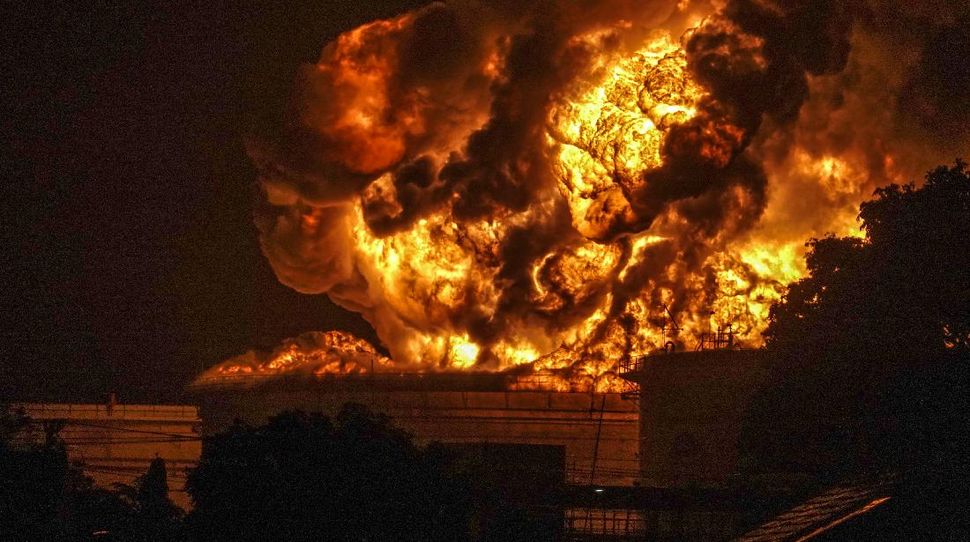 PurnaWarta – Tangki kilang minyak PT Pertamina (Persero) di Cilacap, Jawa Tengah terbakar pada Sabtu (13/11) petang. Kebakaran yang terjadi pada Tangki 36 T 102 pada Sabtu (13/11) pukul 19.10 WIB. Sampai dengan Minggu (14/11) dini hari, kobaran api masih terlihat di tangki kilang yang terbakar. (ANTARA FOTO/Idhad Zakaria/foc).