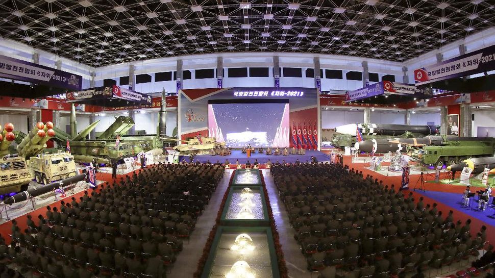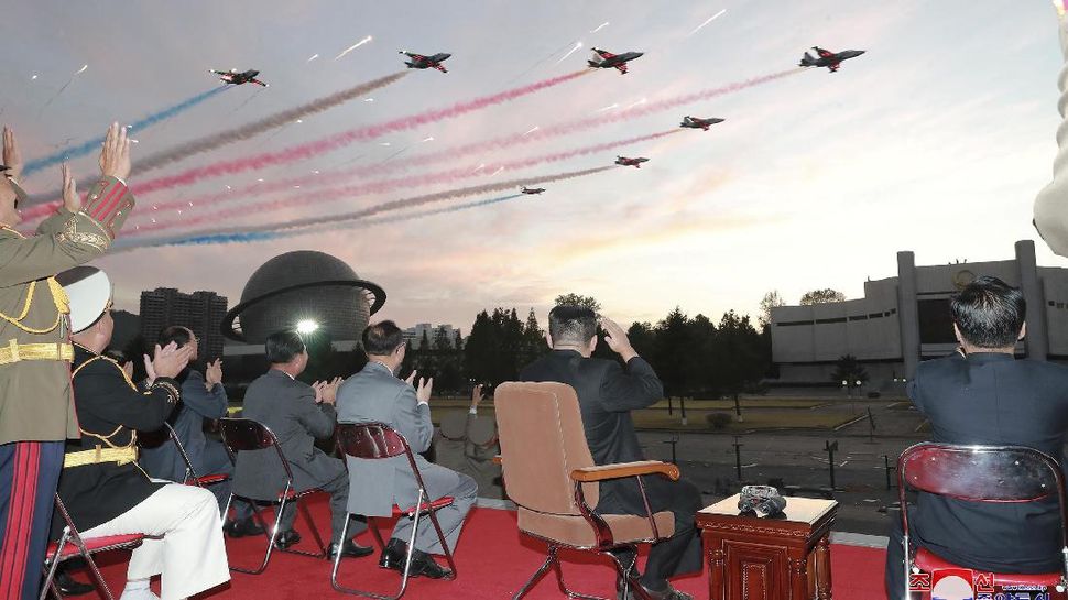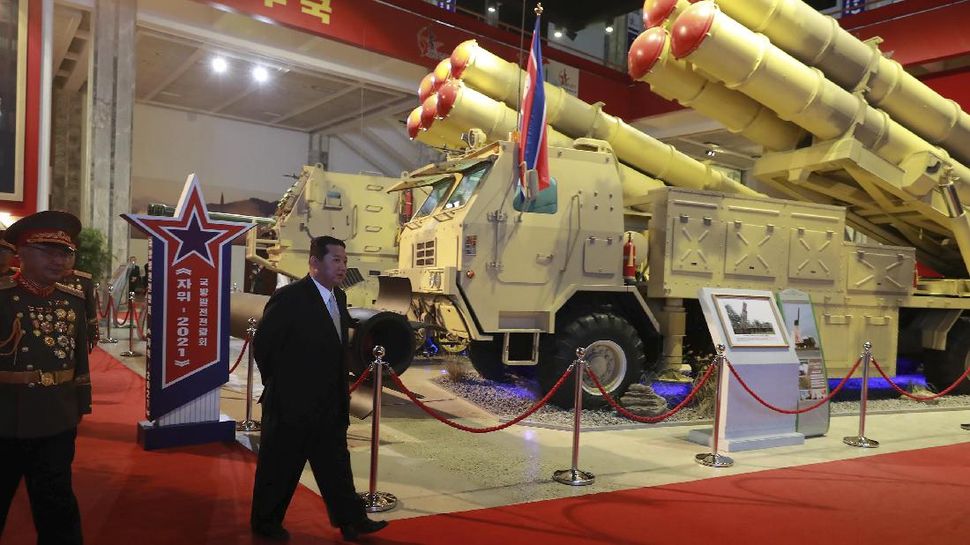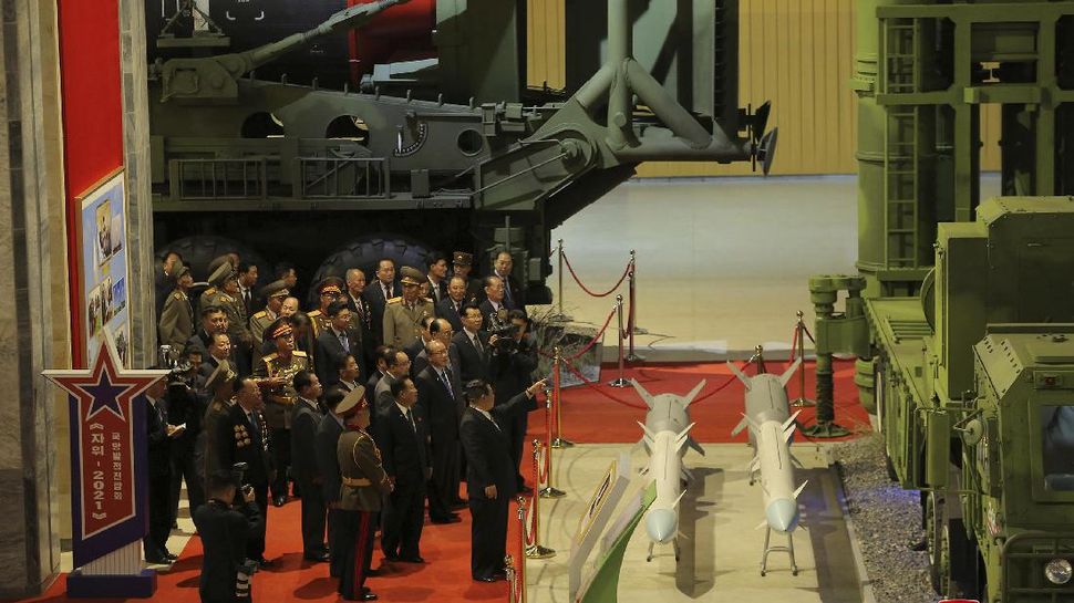 PurnaWarta – Kim Jong-un memamerkan berbagai senjata baru Korea Utara dalam pameran militer dalam rangka perayaan hari jadi Partai Buruh pada Selasa (12/10). (KCNA via Reuters)
