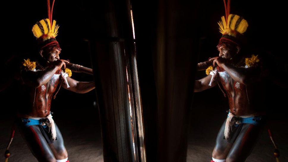 Totomai, seorang pria Yawalapiti, memainkan seruling bambu urua selama ritual pemakaman Kuarup untuk menghormati memori mendiang. (REUTERS/Ueslei Marcelino)