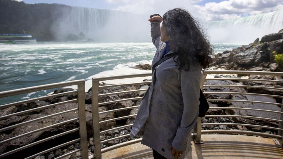 Seorang wisatawan perempuan menyaksikan pemandangan Air Terjun Niagara di Ontario, Kanada, setelah keluar dari terowongan berusia seabad yang pada Juni lalu baru dibuka untuk publik. (Reuters/Carlos Osorio)