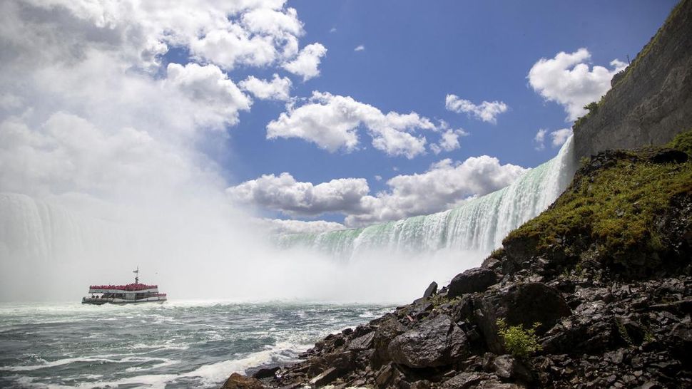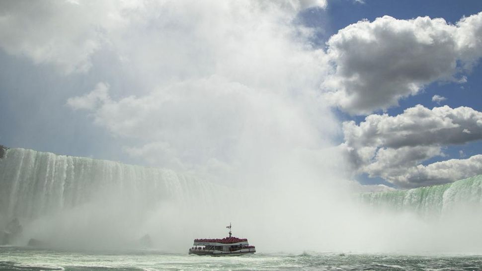 Sebuah kapal Niagara City Cruises mengarungi perairan di sekitar Air Terjun Niagara, Ontario, Kanada. Taman Niagara sendiri didirikan pada 1885 dan dipercaya pemerintah Kanada untuk melestarikan dan melindungi tanah di sekitar Air Terjun Niagara dan Sungai Niagara. (Reuters/Carlos Osorio)