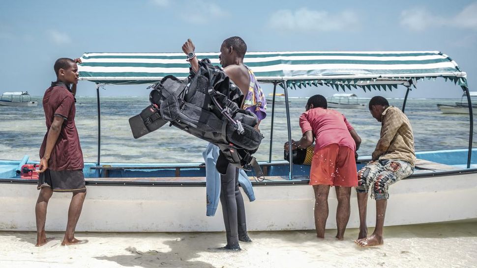 Seorang petugas menurunkan peralatan menyelam dari kapal di Pantai Matemwe, Zanzibar. Selain Pantai Matemwe, wisatawan juga dapat berkunjung ke Pantai Paje, Bwejuu, Nungwi dan Michamvi. (Sumy Sadurni / AFP).