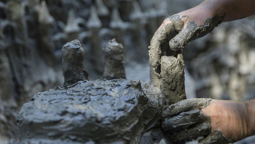Hasil kesenian Monthoux ini terbilang unik. Pasalnya, kreasi seni tersebut dibuat dari lumpur Sungai Le Toleure yang mulai mengering karena cuaca panas. REUTERS/Denis Balibouse