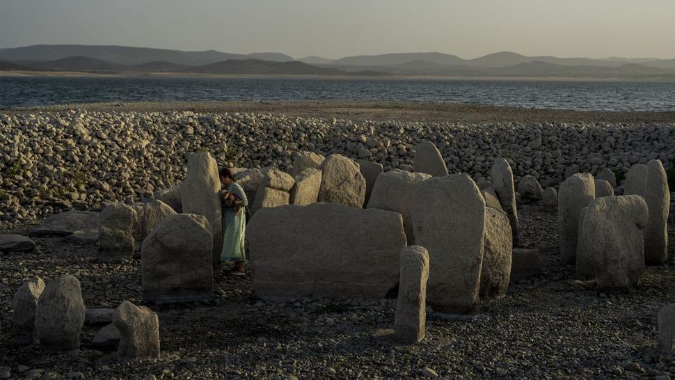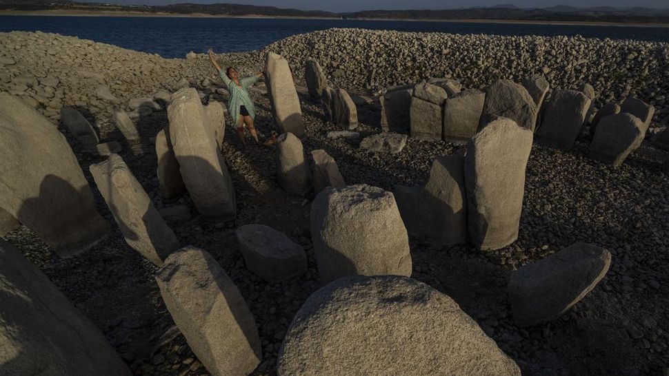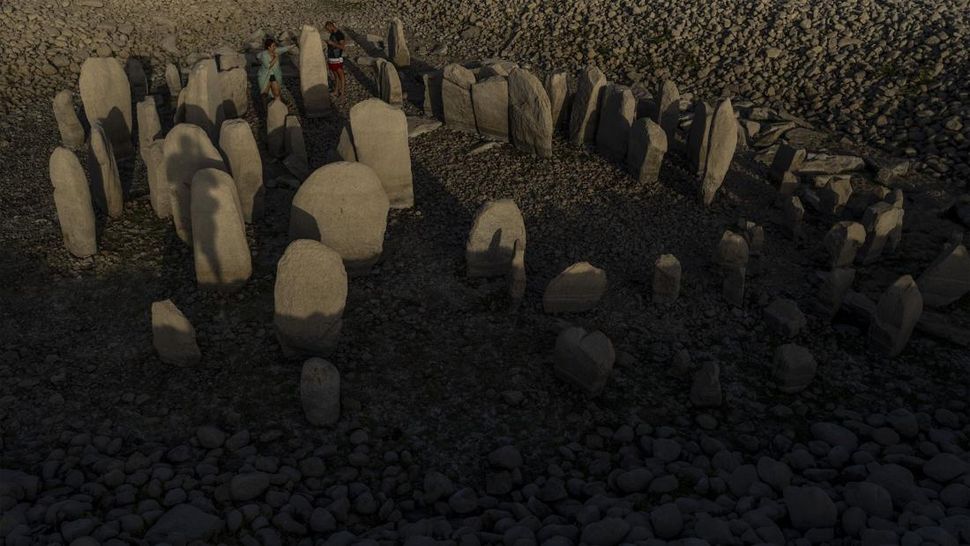 PurnaWarta – The Dolmen of Guadalperal, sebuah monumen megalitik yang muncul karena kekeringan di bendungan Valdecañas di El Gordo, Spanyol, Sabtu (13/8). Itu terjadi setelah tiga gelombang panas dan sedikit hujan yang dimulai pada awal tahun usai musim dingin terkering kedua dalam 60 tahun. (Foto AP/Manu Fernandez)