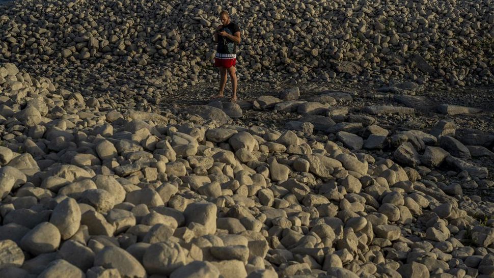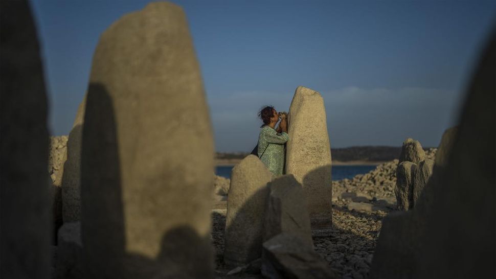 Monumen megalitik berusia 7.000 tahun itu muncul pertama kalinya setelah 50 tahun menghilang di bawah air pada 2019 akibat kekeringan. Satelit Landsat 8 milik NASA mengungkap ketinggian air sangat rendah di Reservoir Valdecañas. (AP Photo/Manu Fernandez)