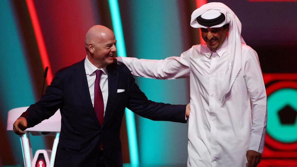 Presiden FIFA Gianni Infantino berbicara dengan Emir Qatar Sheikh Tamim bin Hamad al-Thani saat drawing Piala Dunia 2022. (REUTERS/Kai Pfaffenbach)
