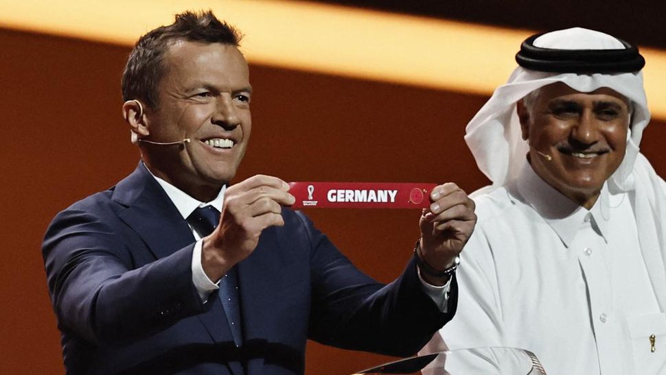 Legenda Jerman Lothar Matthaus yang menjadi asisten drawing menarik kertas bertuliskan Jerman dalam drawing Piala Dunia 2022. Jerman berada satu grup dengan Spanyol di Grup E Piala Dunia 2022. (REUTERS/Hamad I Mohammed)