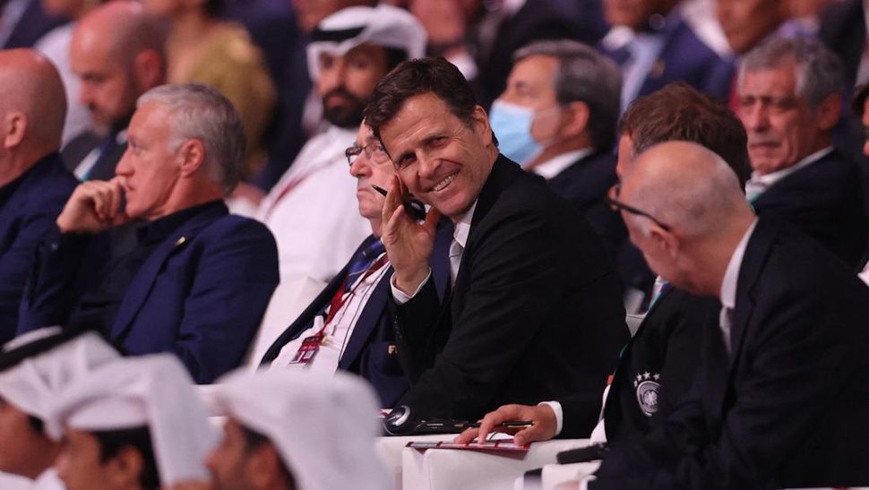 Legenda Jerman yang kini menjabat direktur timnas Jerman Oliver Bierhoff tertawa saat drawing Piala Dunia 2022. (REUTERS/Ibraheem Al Omari)