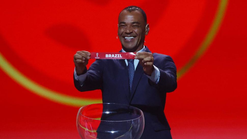 Legenda Brasil Cafu menarik kertas bertuliskan Brasil pada drawing Piala Dunia 2022. Brasil berada di Grup G bersama Serbia, Swiss, dan Kamerun. (REUTERS/Kai Pfaffenbach)