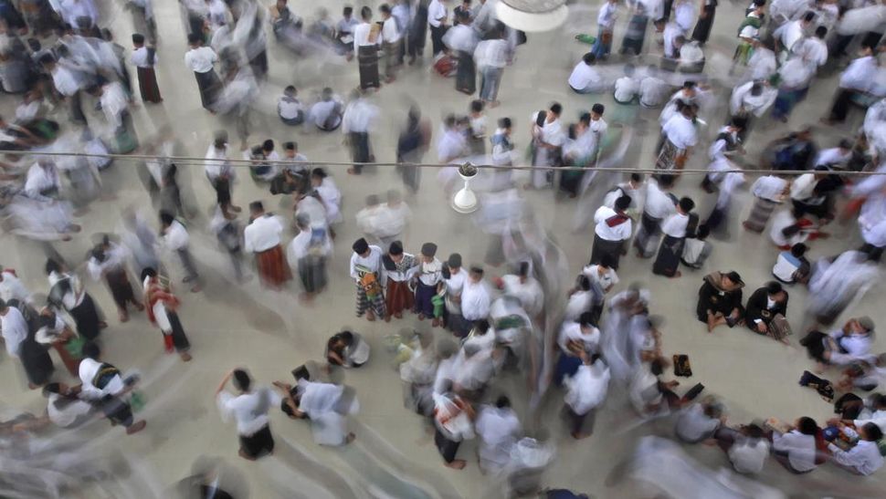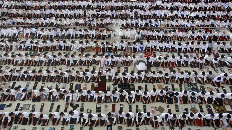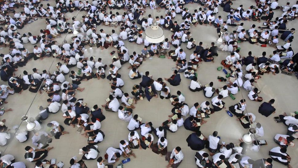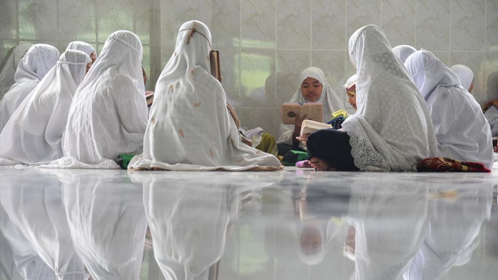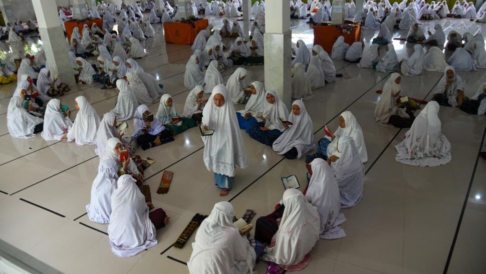 Para santri putra melaksanakan tadarusan dengan membentuk bulatan. Sementara santri putri berada di lokasi terpisah. (AP Photo/Binsar Bakkara)