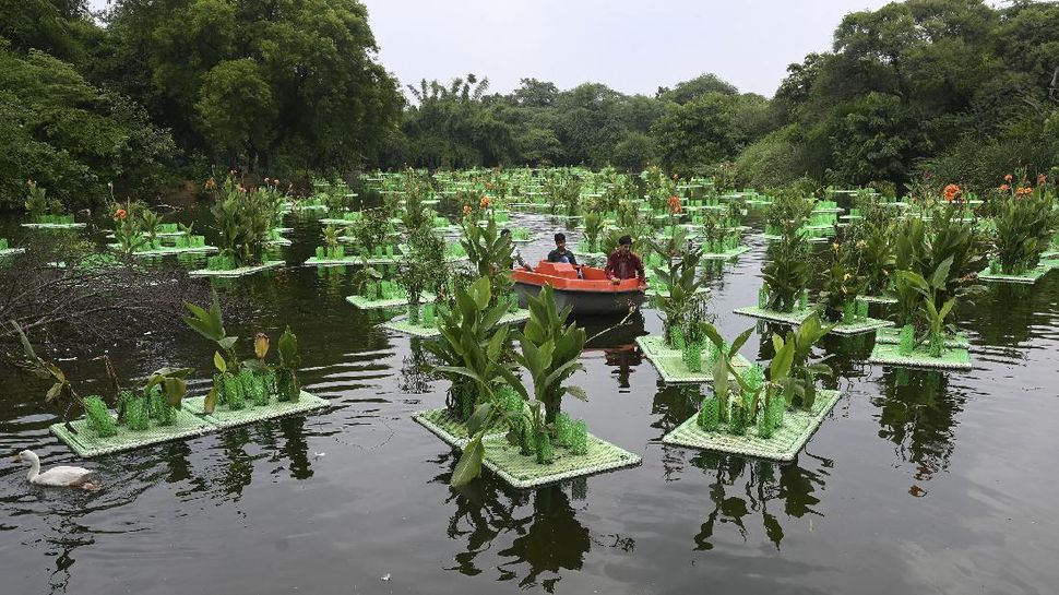 PurnaWarta – Pemerintah Ibu Kota New Delhi, India, menggunakan teknik lahan basah terapung dalam proyek percontohan perbaikan, pembersihan dan pemulihan ekosistem Danau Sanjay Van. (Sajjad HUSSAIN/AFP)