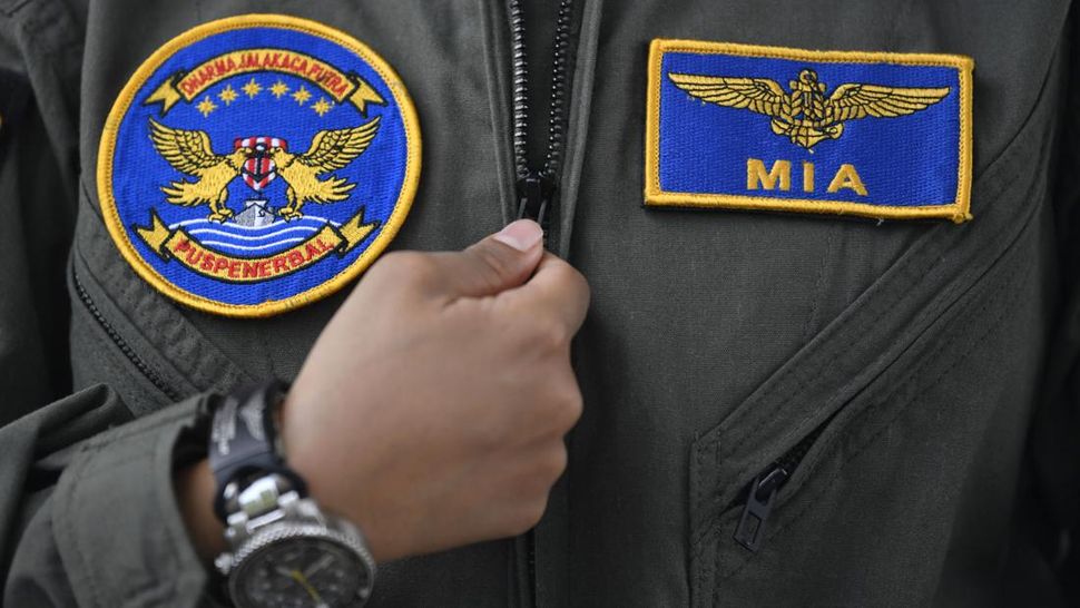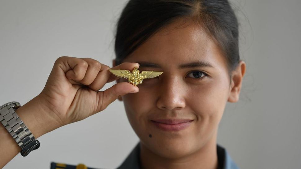 Letda Laut (P/W) Mia Khuzaimah Hanun berpose dengan pin brevet penerbang TNI AL di Pupenerbal, Sidoarjo, Jawa Timur. (ANTARA FOTO/Zabur Karuru)