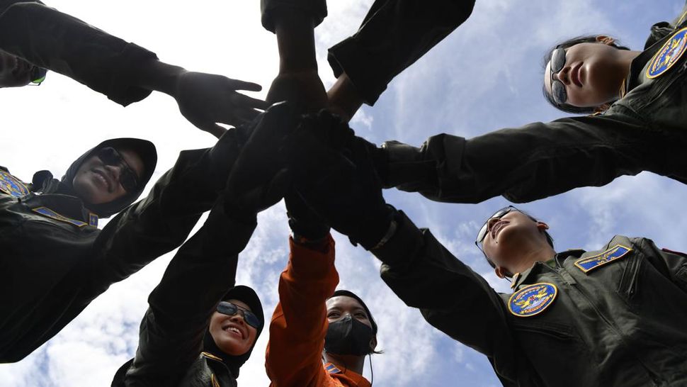 Letda Laut Catur Arum Nuryani bersama Letda Laut Mia Khuzaimah Hanun , Letda Laut Andi Quita Wetuffahati (kanan), Letda Laut Virnanda Steffy Aulia dan Letda Laut Nurida Yuliana Wati melakukan salam kompak sebelum latihan di Shelter Skuadron 200 Wing Udara 2, Pupenerbal, Sidoarjo. (ANTARA FOTO/Zabur Karuru)