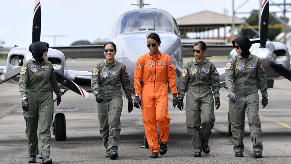 PurnaWarta – Letda Laut Catur Arum Nuryani (kiri) bersama Letda Laut Mia Khuzaimah Hanun (kedua kiri) dan Letda Laut Andi Quita Wetuffahati (kedua kanan) serta Letda Laut Virnanda Steffy Aulia (kanan) merupakan Rajawali Laut perempuan alias para penerbang TNI-AL. (ANTARA FOTO/Zabur Karuru)