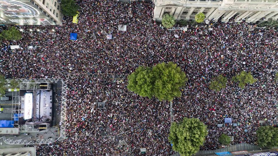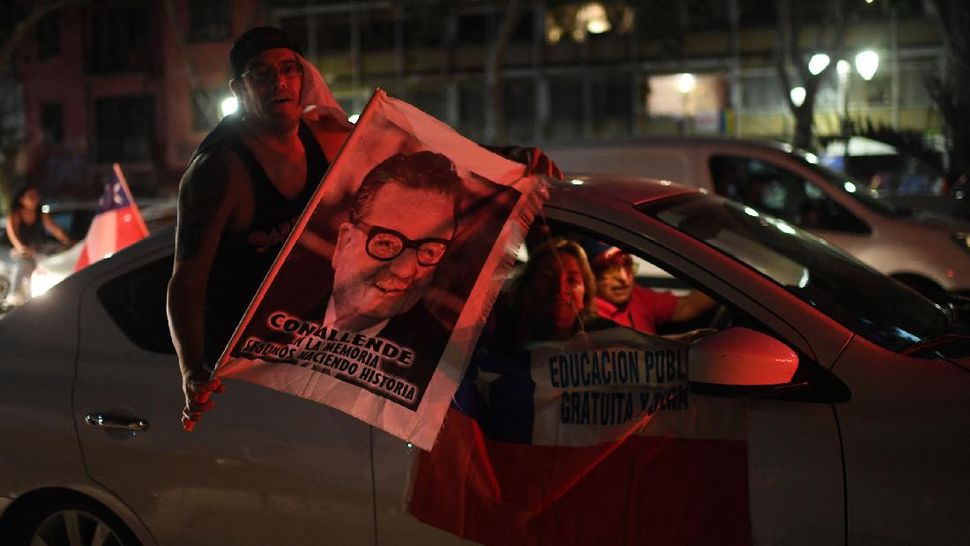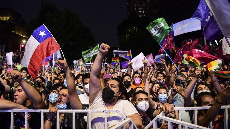 Sejumlah pendukung Boric, terutama kaum buruh, menyambut baik kemenangan Boric. Mereka menganggap kemenangan Boric sebagai awal perubahan menuju negara yang lebih manusiawi dan setara bagi seluruh golongan. (Photo by MAURO PIMENTEL / AFP)