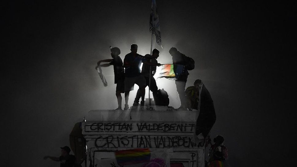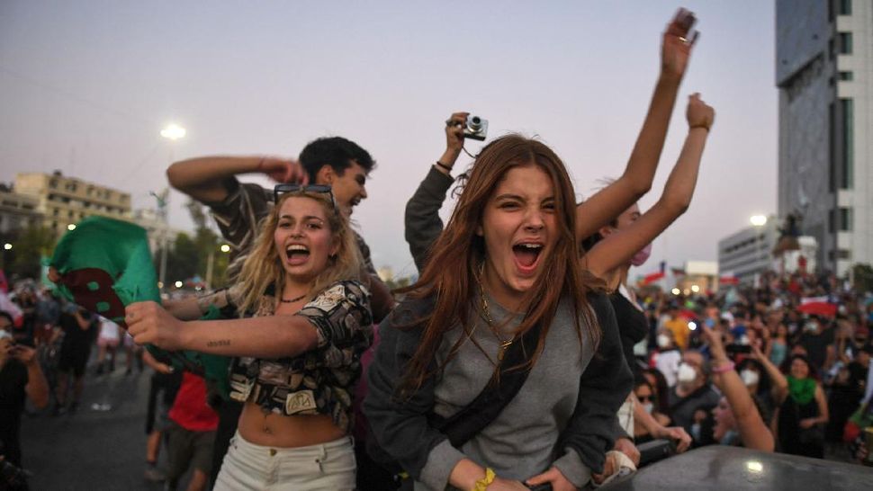 Para pendukung Boric bersorak-sorai menyambut pemimpin baru mereka yang mencetak sejarah sebagai pemimpin termuda negara Amerika Latin tersebut. (Photo by MARTIN BERNETTI / AFP)