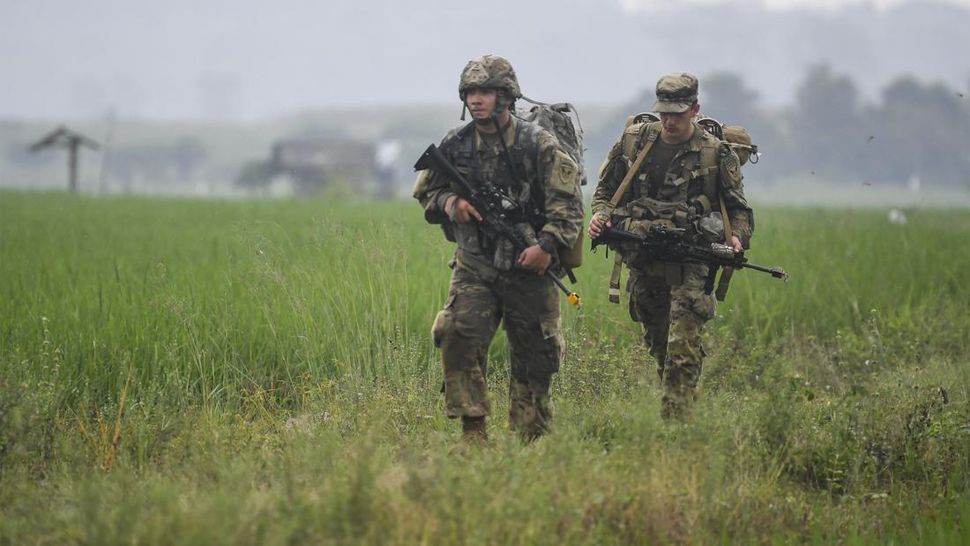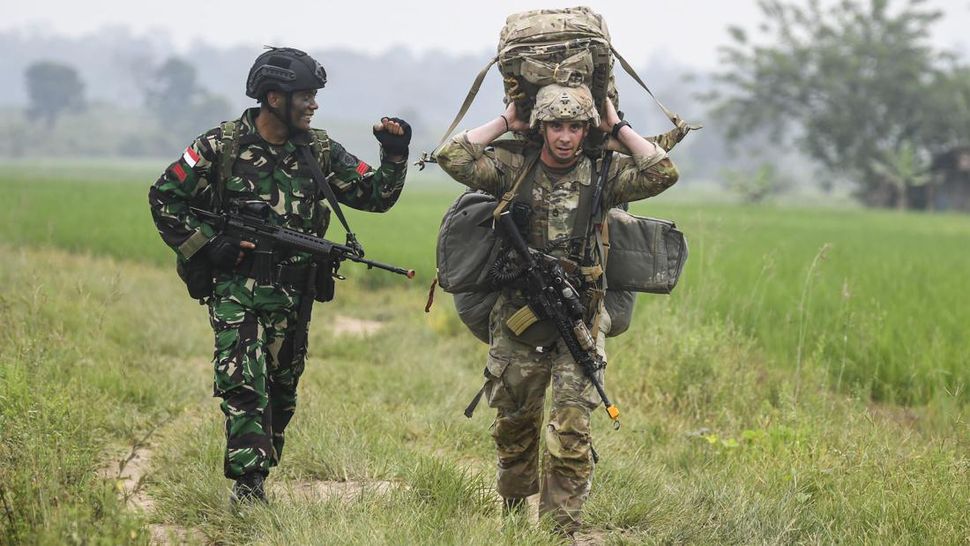 Seorang prajurit TNI AD (kiri) berjalan bersama dengan seorang prajurit Angkatan Darat Amerika Serikat atau US Army usai terjun payung saat Latihan Bersama Super Garuda Shield (SGS) (ANTARA FOTO/M Risyal Hidayat/wsj.)
