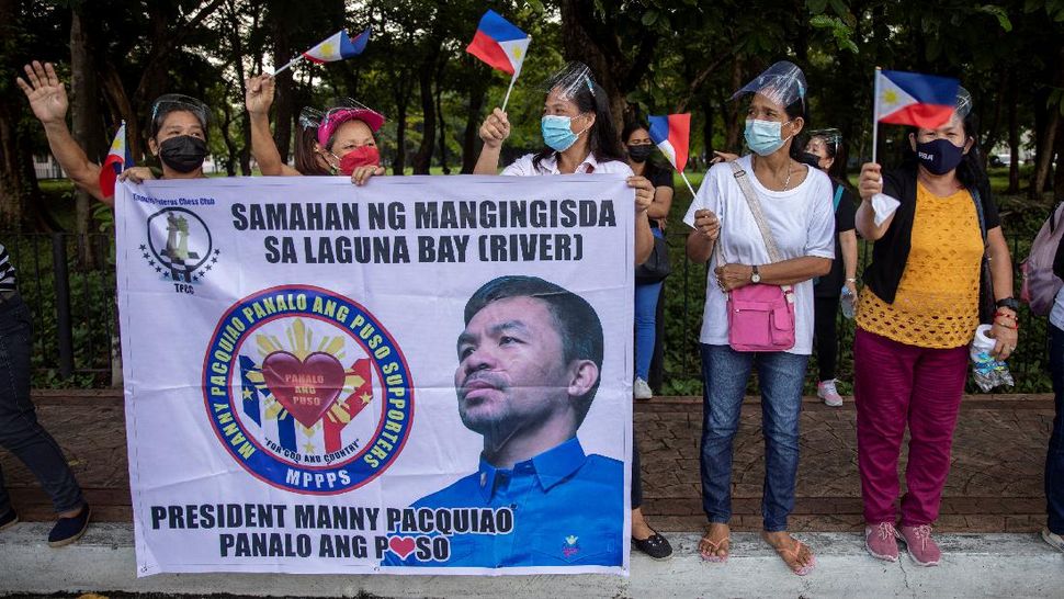 PurnaWarta – Pendukung mantan atlet tinju sekaligus senator Manny pacquiao berbondong-bondong mendatangi Komisi Pemilihan Umum Filipina menemani sang legendaris tinju mendaftarkan diri sebagai calon presiden. (AP Photo/Aaron Favila)