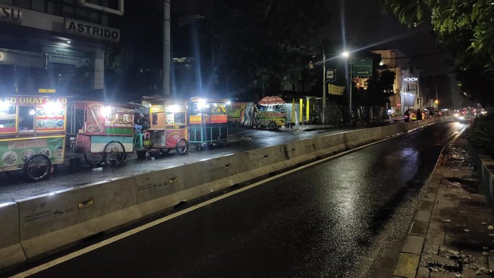 Tidak banyak warga yang terlihat mampir untuk makan di lapak para PKL tersebut. Para pedagang tampak mendirikan tenda untuk memayungi gerobak dagangannya dari hujan.