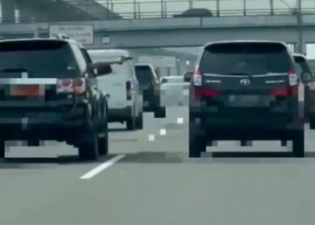Sopir mobil plat dinas kemudian mencoba menyalip dari kiri, tetapi tidak juga diberikan jalan oleh pengemudi mobil tersebut. Hingga kemudian sopir mobil plat merah itu mengeluarkan pistol dan menodongkan ke pengemudi mobil yang hendak dia salip tersebut.