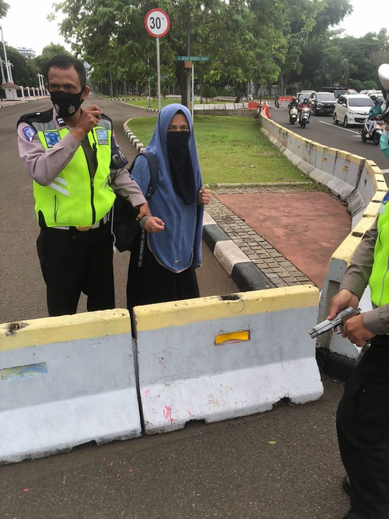 Peristiwa itu terjadi di pintu masuk Istana Negara, Jalan Medan Merdeka Utara. Wanita itu terlihat menggunakan pakaian hitam, berkerudung biru dan bercadar, serta membawa tas. Namun, belum ada informasi soal identitas wanita itu.