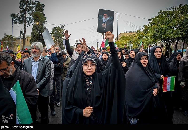 Para pelayat, mengenakan pakaian hitam, membawa spanduk dan foto almarhum Pemimpin, meneriakkan slogan-slogan untuk menghormatinya dan melampiaskan kemarahan mereka kepada Amerika Serikat dan rezim Zionis.